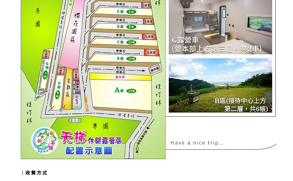 在綠意環境繞中一階階的天梯有著別樣的美麗,「天梯休閒露營區」擁有獨特地勢環境,景鄰茶園與櫻花園,能眺望開闊的蘭陽平原,閉上眼感受微風輕撫臉旁,帶來自然香氣,在這裡一年四季、白日黑夜,皆有不同的動人風情,歡迎蒞臨天梯露營區,體驗有別以往的露營饗宴。 |